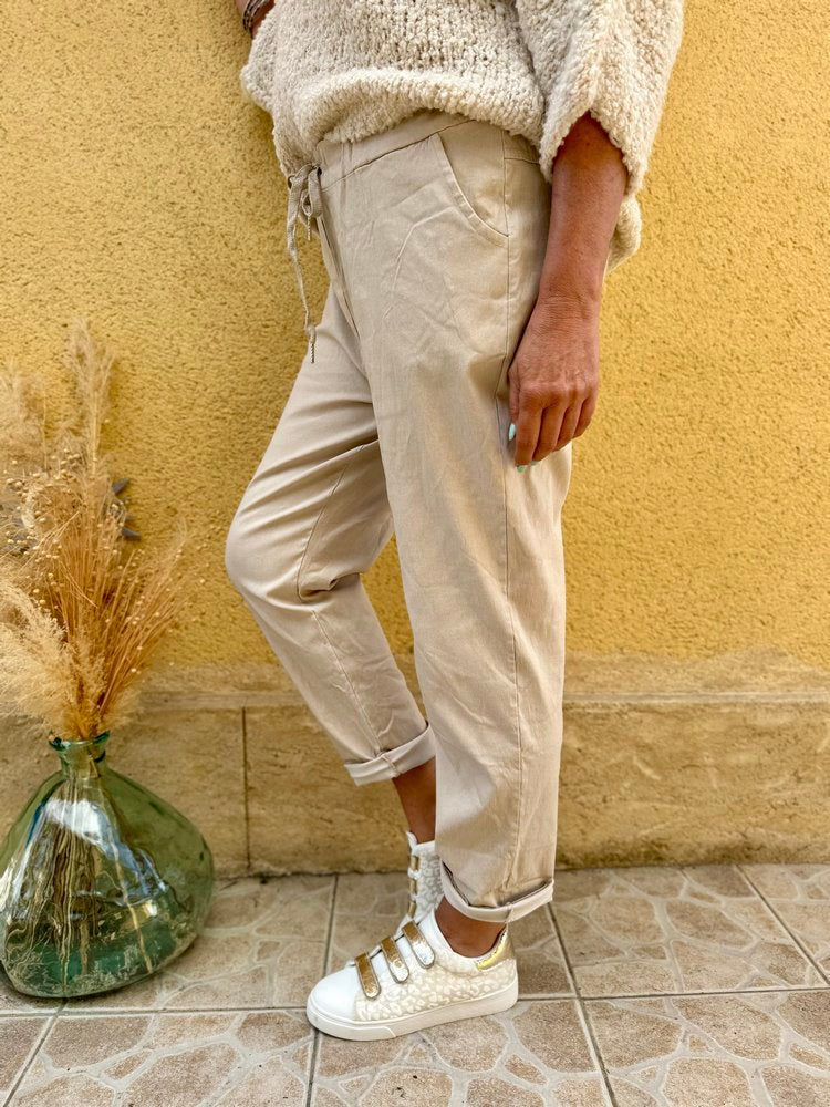 - Taille élastiquée qui se resserre par un cordon travaillé d'un fil brillant