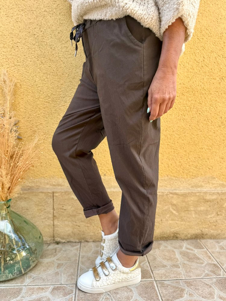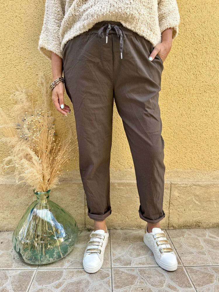 - Taille élastiquée qui se resserre par un cordon travaillé d'un fil brillant