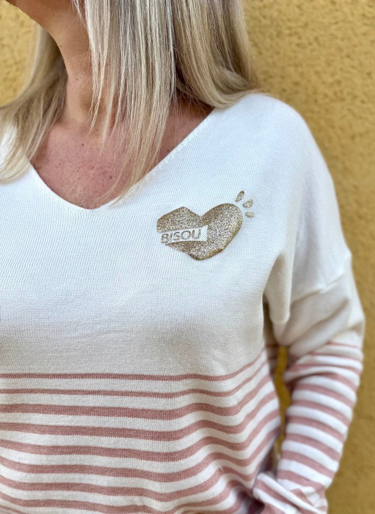 - Cœur doré avec inscription "bisou" sur la poitrine gauche