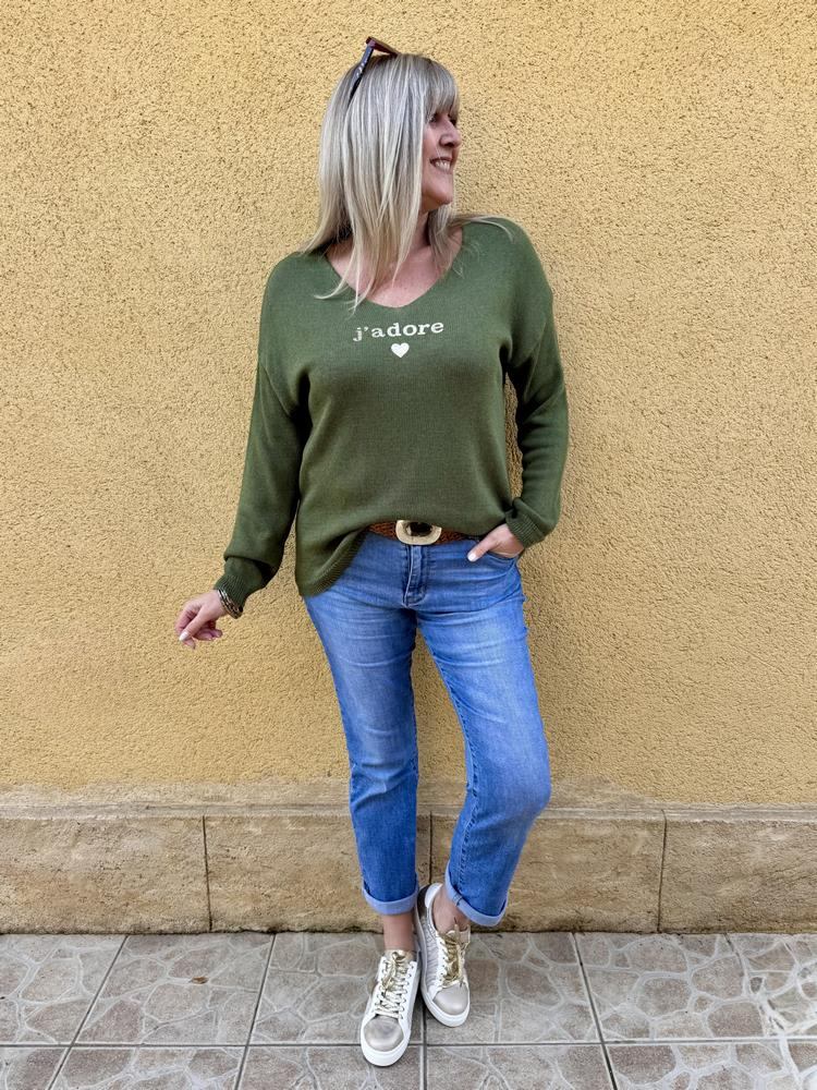 - Inscription "j'adore" et motif cœur doré sous l'encolure