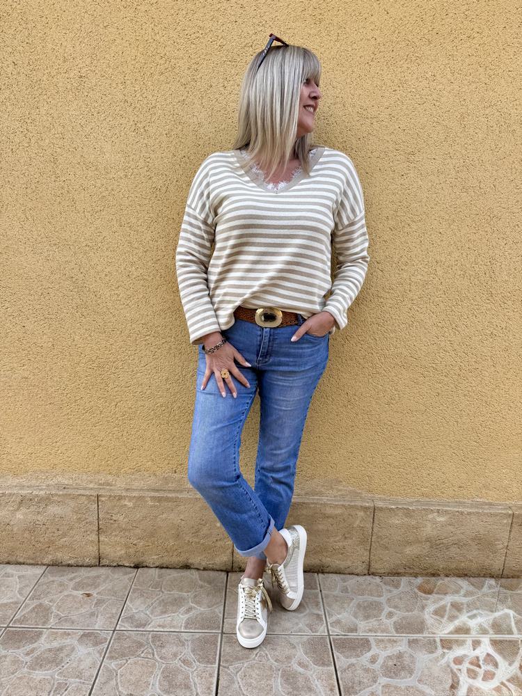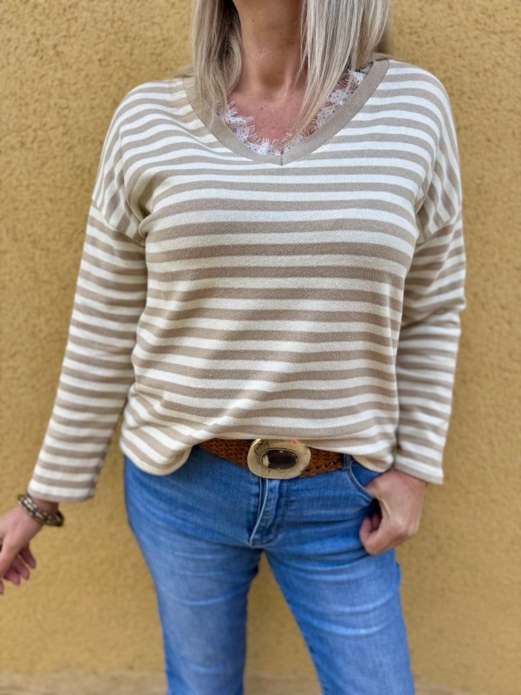 - Encolure V avec petit bord côte uni doublé de dentelle
