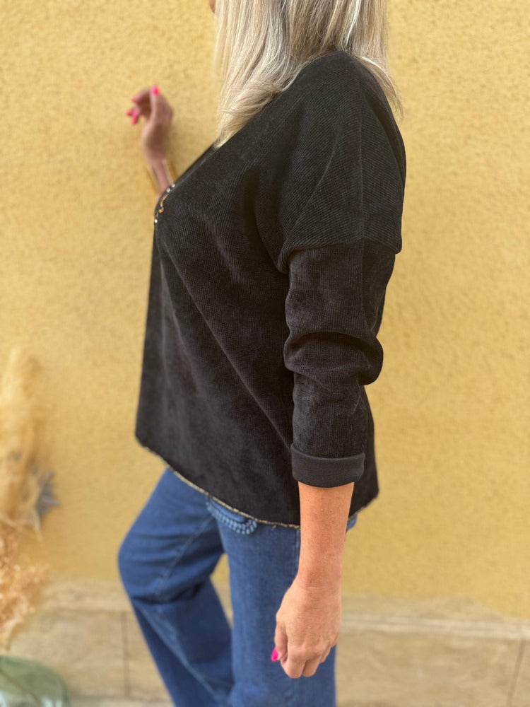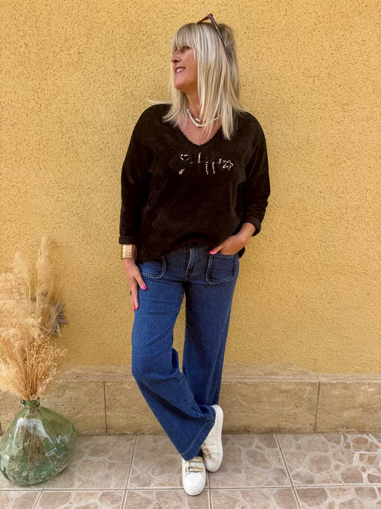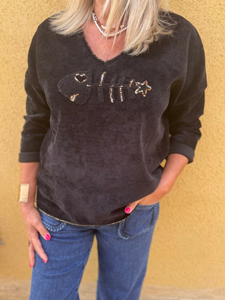 - Motif Poisson en relief travaillé de sequins dorés sur le devant