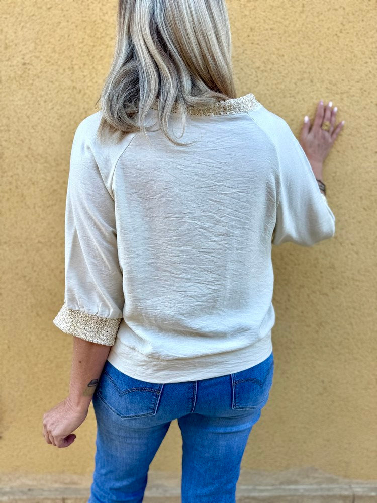 - Col et bas des manches travaillé d'un large biais doré